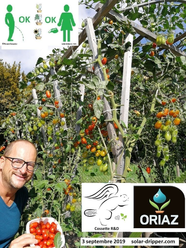 Ensemble goutte-à-goutte prêt à l'usage avec 9 goutteurs solaires ORIAZ et 9 bouteilles rigides calibrées d'un litre. Bonus : un goutteur solaire gratuit avec sa carte postale ( sans bouteille). Cet ensemble de qualité vous permet d'arroser 10 plantes d'intérieur, de balcon ou du jardin. Le régulateur Thermodynamique Cossette révolutionne l'arrosage goutte à goutte avec son débit morcelé beaucoup plus lent et automatiquement synchronisé avec l'évapotranspiration. En plus ce régulateur breveté par tension de surface dispose d'une ouverture 100 fois plus grande que les goutteurs classiques. Il vous permet d'utiliser l'eau de pluie et tous les bio-fertilisant sans se boucher. Selon l'intensité du cycle de la température le goutteur ORIAZ arrose environ 10 à 40 jours à l'intérieur et 2 à 10 jours à l'extérieur. Fabriqué à Annecy en France. Reconnu Solution Efficiente par la fondation SolarImpulse.