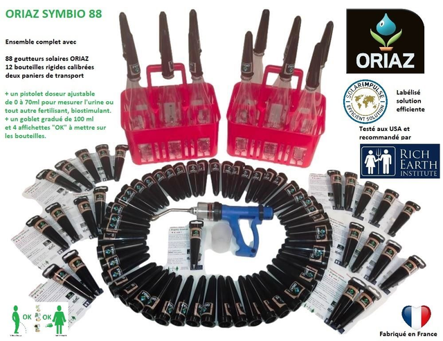 Voici le meilleur équipement pour valoriser l'urine fertilisante et organiser un jardin de 50 à100 m². Cet ensemble convient aussi parfaitement aux producteurs truffiers pour inoculer des spores ou propagules. L'ensemble comprend 88 goutteurs solaires ORIAZ ultra résistants au colmatage ( > 2mm) , le pistolet doseur ajustable pour mesurer la quantité de mélange entre 10 et 70 ml dans chaque bouteille, deux paniers pratiques avec 12 bouteilles rigides calibrés idéales pour transporter l'urine. Cet équipement complet vous permet d'appliquer la méthode ORIAZ avec des résultats et une sécurité éprouvée. Initiez vos amis, votre club, votre Amape, vos étudiants sur les avantages écologiques de l'urine fertilisante. Vous aurez en main les meilleurs outils disponibles pour obtenir des récoltes délicieuses. Le guide de d'uro-fertilisation ORIAZ inclus pour cultiver vos tomates, courges, ail, tournesols géants etc. Compatible avec tous les engrais, biofertilisant et l'eau non flitrée.