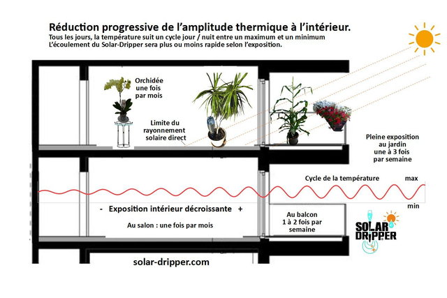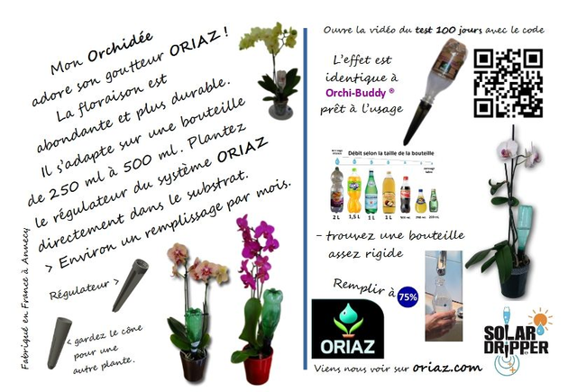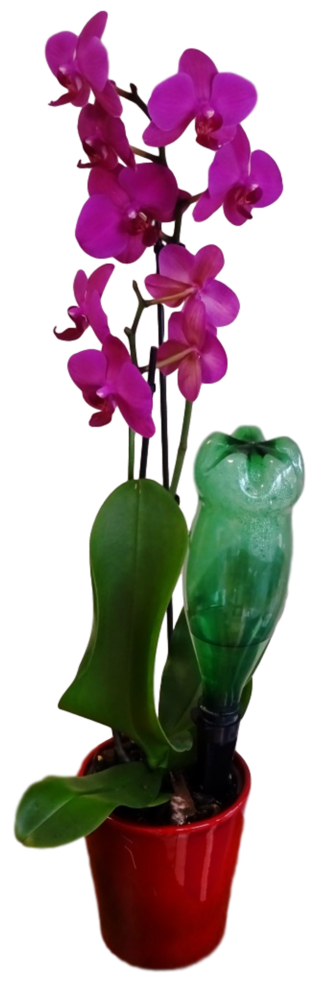 Voici le compagnon idéal pour 6 Orchidées: l'Orchi-Buddy arrose délicatement avec un débit ultra lent durant environ un mois. Il suffit de remplir la petite bouteille jusqu'au point bleu, de visser le piquer régulateur et de le planter directement dans les copeaux. Les cycles de température de votre salon vont provoquer des écoulements d'eau très lent et synchronisé avec l'évapotranspiration. Lot de 6 prêt à l'usage avec 6 bouteilles rigides calibrées de 330 ml. https://solar-dripper.com/arrosage-orchidee/