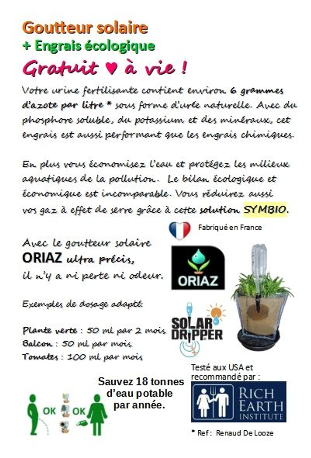 Lot de 28 goutteurs solaire emballés avec la carte d'information sur l'urine fertilisante. Idéal pour vos cadeaux d'entreprises, pour les écoles ou associations. L'urine fertilisante est un moyen extraordinaire de fertiliser vos plantes et de protéger l'environnement. Il est temps de l'essayer personnellement !