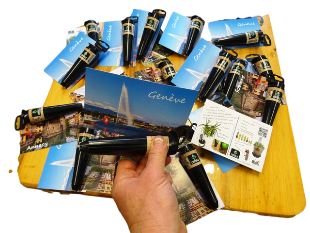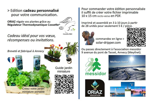 Commandez vos goutteur Solaire ORIAZ personnalisés avec une carte postale de 10 cm par 15 cm. Idéal comme cadeau d'entreprise, de collectivité et d’évènementiel. Pour vos vœux de fin d'année, vacances, lancements, invitations etc. Les colis de 28 unités ou de 280 unités sont préparés à Annecy en 3 à 10 jours ouvrables. Envoyez votre montage recto verso par e-mail ( PDF de qualité impression 10 cm x 15 (+ 5mm de marge) à 300 dpi ou plus). Imprimé et assemblé à Annecy par l'association Messidor.